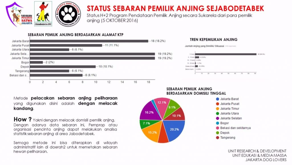 Dalam rangka pendataan pemilik Anjing untuk mengetahui jumlah sebaran anjing di wilayah Jabodetabek. Yayasan Pencinta Satwa Jakarta melalui Jakarta Dog Lovers dan komunitas-komunitas pencinta anjing yang ada pada tahap awal ini akan melakukan pendataan pemilik anjing. Serta melakukan estimasi sebaran kepemilikan anjing berbasis komunitas dan independen.