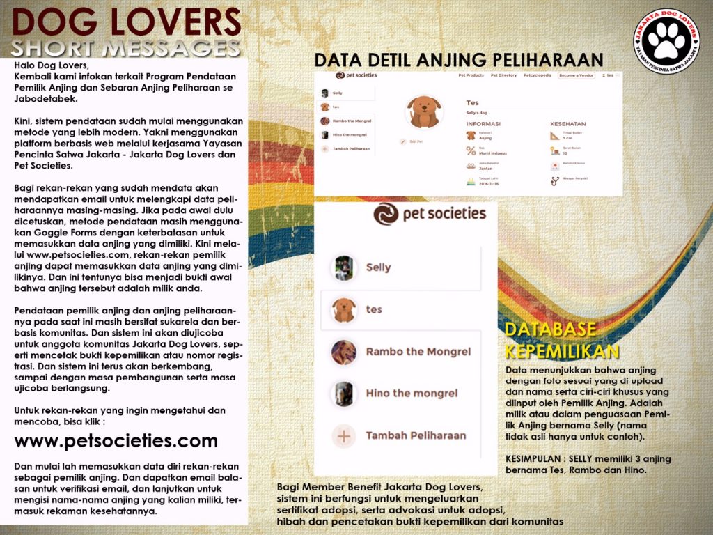 Dalam rangka pemutakhiran sistem pendataan pemilik anjing dan juga pemetaan sebaran hewan peliharaan jenis anjing. Jakarta Dog Lovers dan Pet Societies melakukan kerjasama dengan menggunakan fasilitas website www.petsocieties.com dalam melakukan pendataan pemilik anjing dan hewan peliharaan yang dimilikinya.